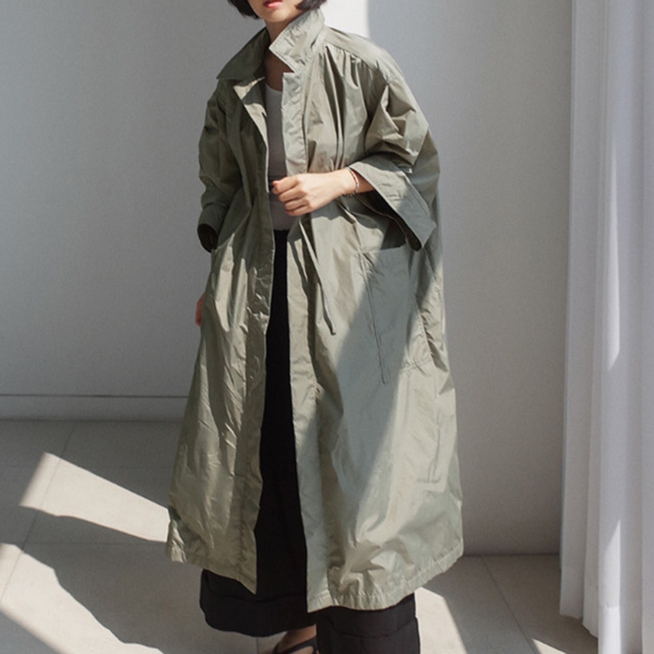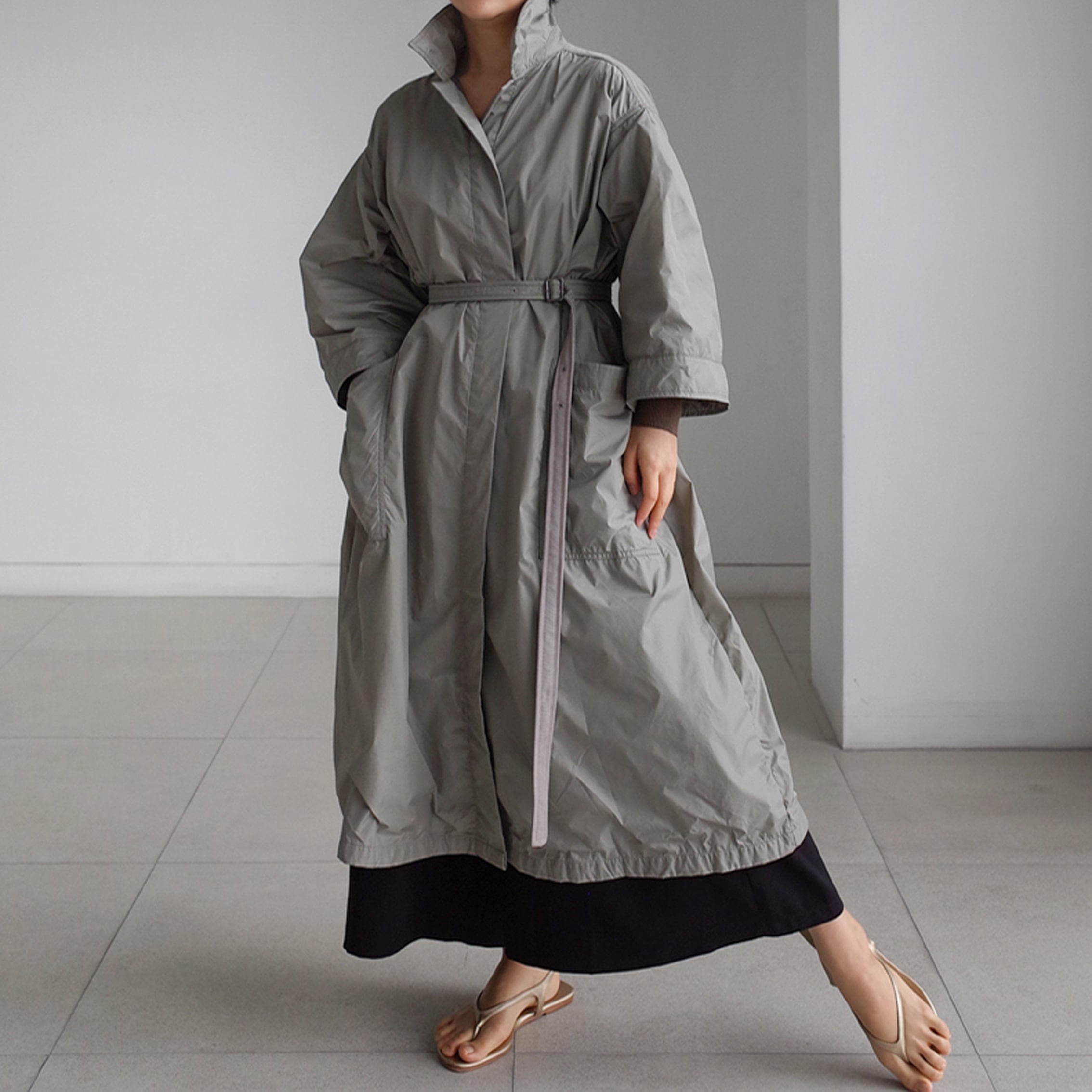スタンドアップカラーで首元まで防寒が出来るトレンチコート。
