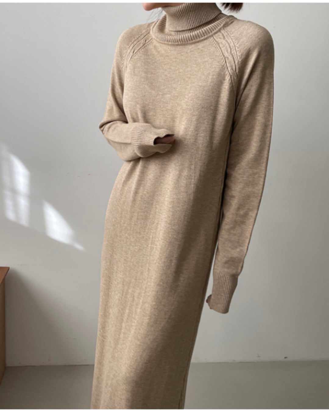 ハイネックのロングニットドレス。シンプルなデザインながらもモダンな印象。